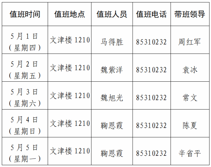 注意事项:1、按时上下班;2、保持办公场所干净整洁;3、注意安全和防火,每天定时巡查学院办公场所;4、值班结束时须做好办公室钥匙的交接工作;5、遇紧急突发情况,及时向相关领导汇报。