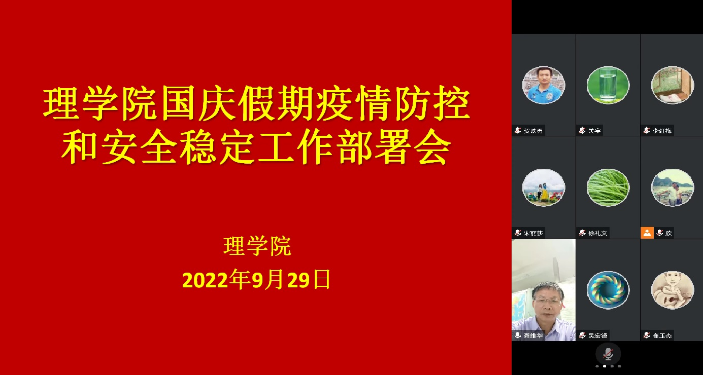 为落实学校关于国庆假期安全稳定工作的会议精神,9月29日晚,taptap点点官网线上召开国庆假期安全稳定和疫情防控工作部署会。学院党委委员、班子成员、系主任、责任教授、支部书记、班导师、辅导员、办公室全体老师参加会议。会议由学院党委书记龚维华主持。