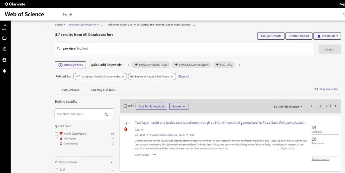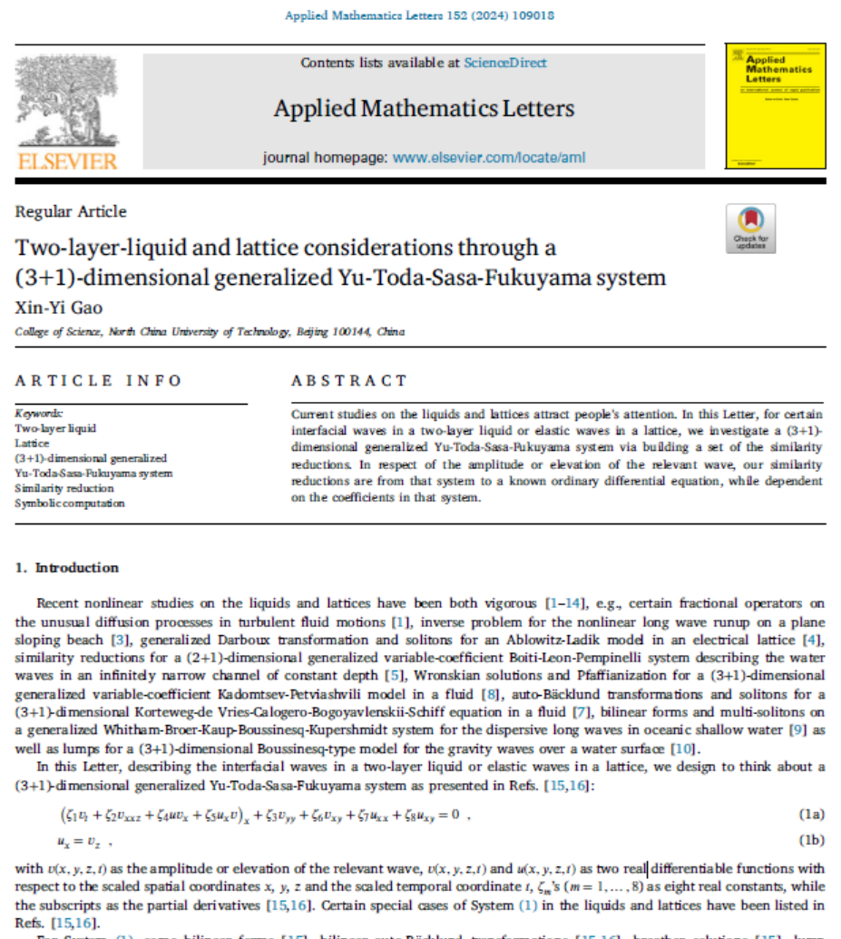 近日,taptap点点官网taptap点点官网教师高心怡在Applied Mathematics Letters(应用数学快报)发表的标题为Two-layer-liquid and lattice considerations through a (3+1)-dimensional generalized Yu-Toda-Sasa-Fukuyama system[通过(3+1)维广义Yu-Toda-Sasa-Fukuyama系统考察双层液体和晶格]的文章入选“ESI热点论文”。