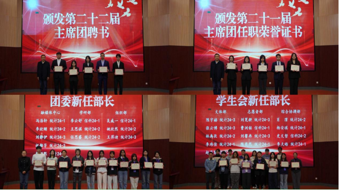 贺映勇为第二十一届主席团成员颁发任职荣誉证书,并为第二十二届主席团成员颁发聘书;夏丹梅、熊敏分别为第二十一届团委、学生会优秀部长和志愿者以及新任部长颁发聘书与表彰奖状。