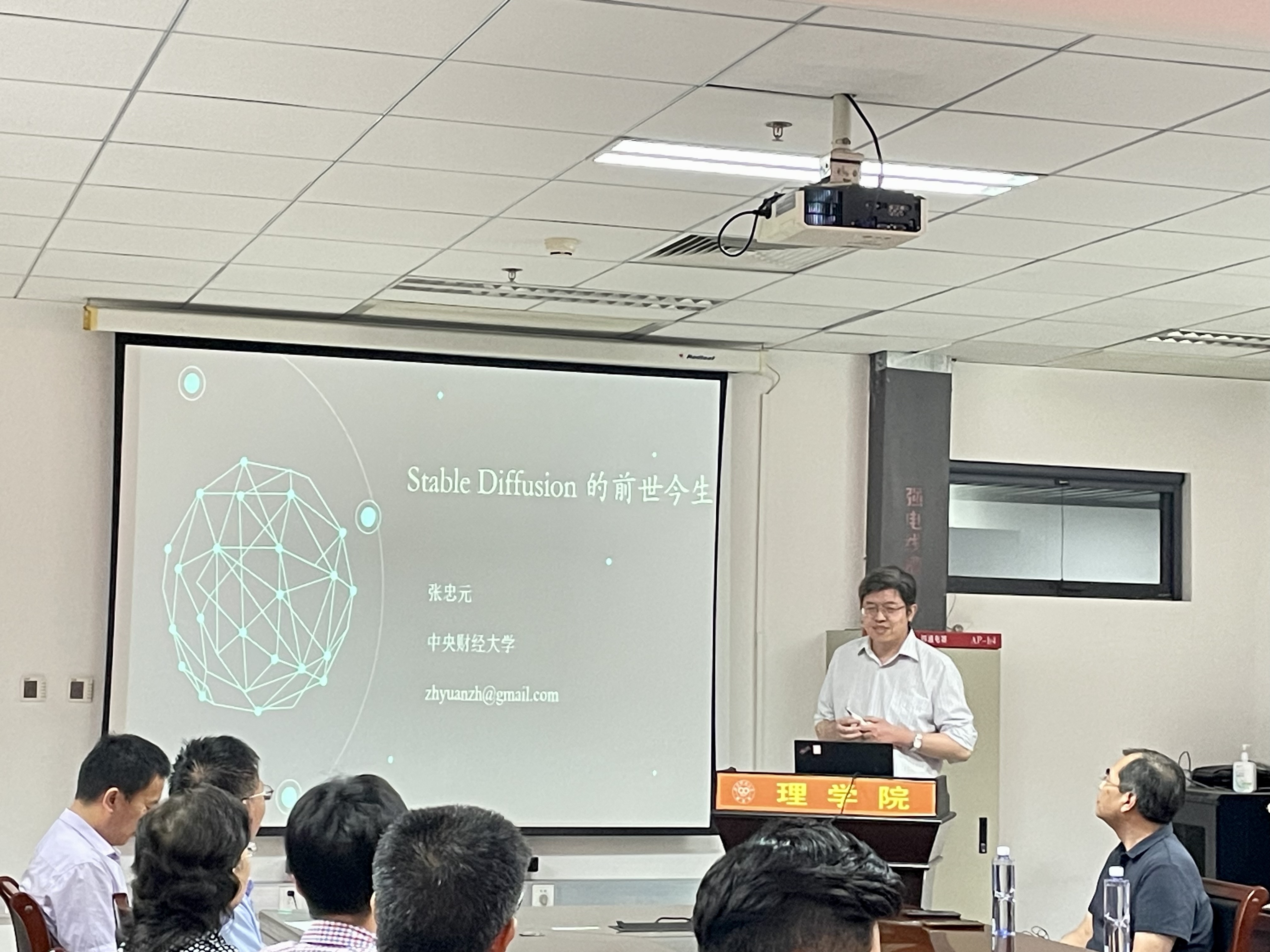 中央财经大学统计与数学学院张忠元教授做了题为“stable Diffusion的前世今生”的学术报告。张教授介绍了生成模型的基本原理和常见方法,包括变分自解码器、生成对抗网络和扩散模型等,这些方法可以用来建模和生成各种类型的数据,包括从简单的图像和文本到复杂的时间序列和网络结构等。最后介绍了生成模型的挑战和未来发展方向。