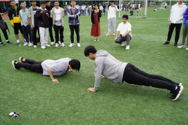 第三个游戏“多姿多彩过国庆”。同学们使出浑身解数,有的翻跟头,有的俯卧撑,各展绝活,在展示自我的同时也加深了同学们间的默契。